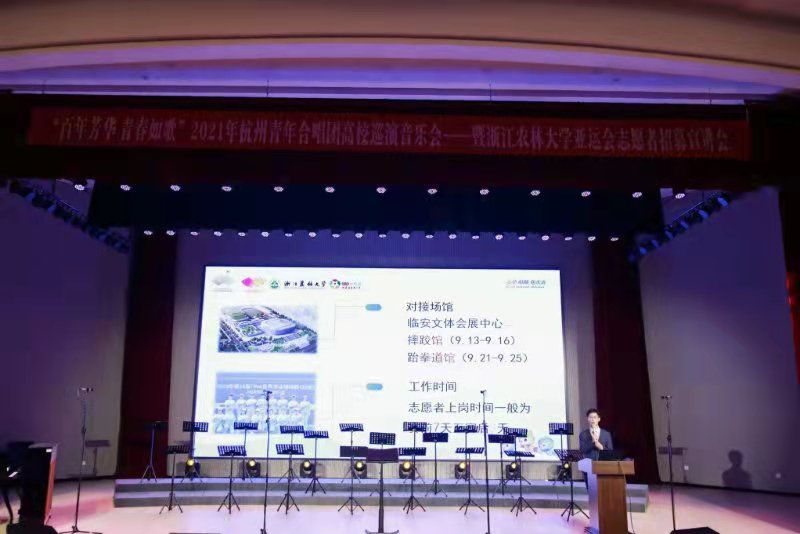 9月12日晚,以“百年芳华、青春如歌”为主题的高校巡演音乐会暨学校亚运会志愿者招募宣讲会举办。本次活动由杭州市文化馆、浙江农林大学主办,杭州青年合唱团、校团委、艺术教育中心承办。音乐会期间,学校亚运会志愿者招募活动也顺利预热。