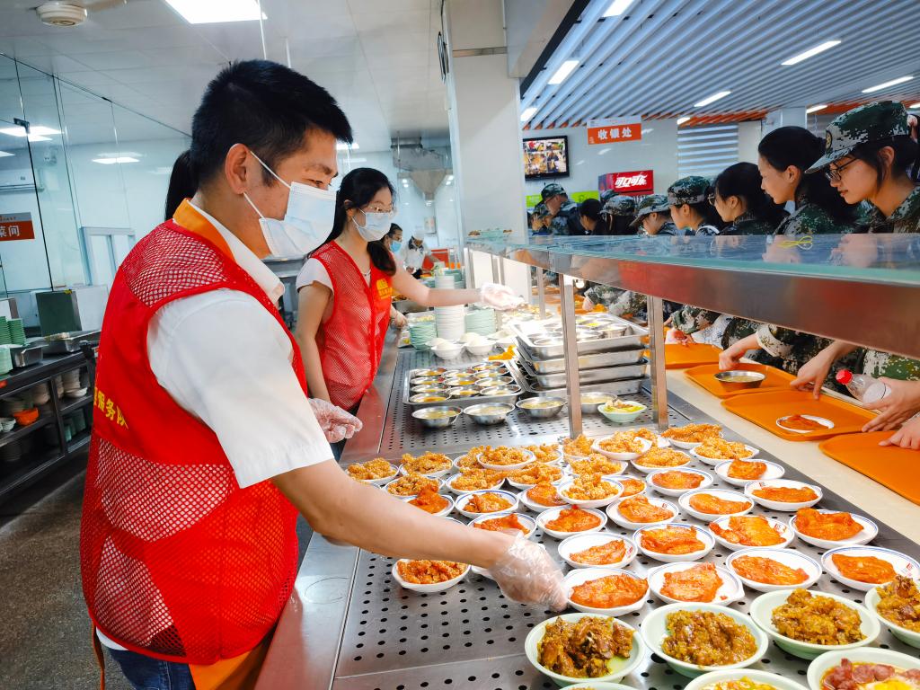 因新生报到及军训,用餐时间比较集中,餐饮中心员工严重不足,后勤服务中心党委及时组织党员、预备党员、入党积极分子等40余人组成餐饮服务志愿队,支援各食堂保证师生正常用餐。根据餐饮服务工作需要,在餐饮服务保障压力最大的中晚餐时间段,志愿者们主动补位、履行职责、积极作为,全身心投入到志愿服务活动当中,熟练打菜、维护秩序,对待工作一丝不苟,切实融入到餐饮服务保障队伍当中,助力各食堂做好日均23000余人次的餐饮保障。