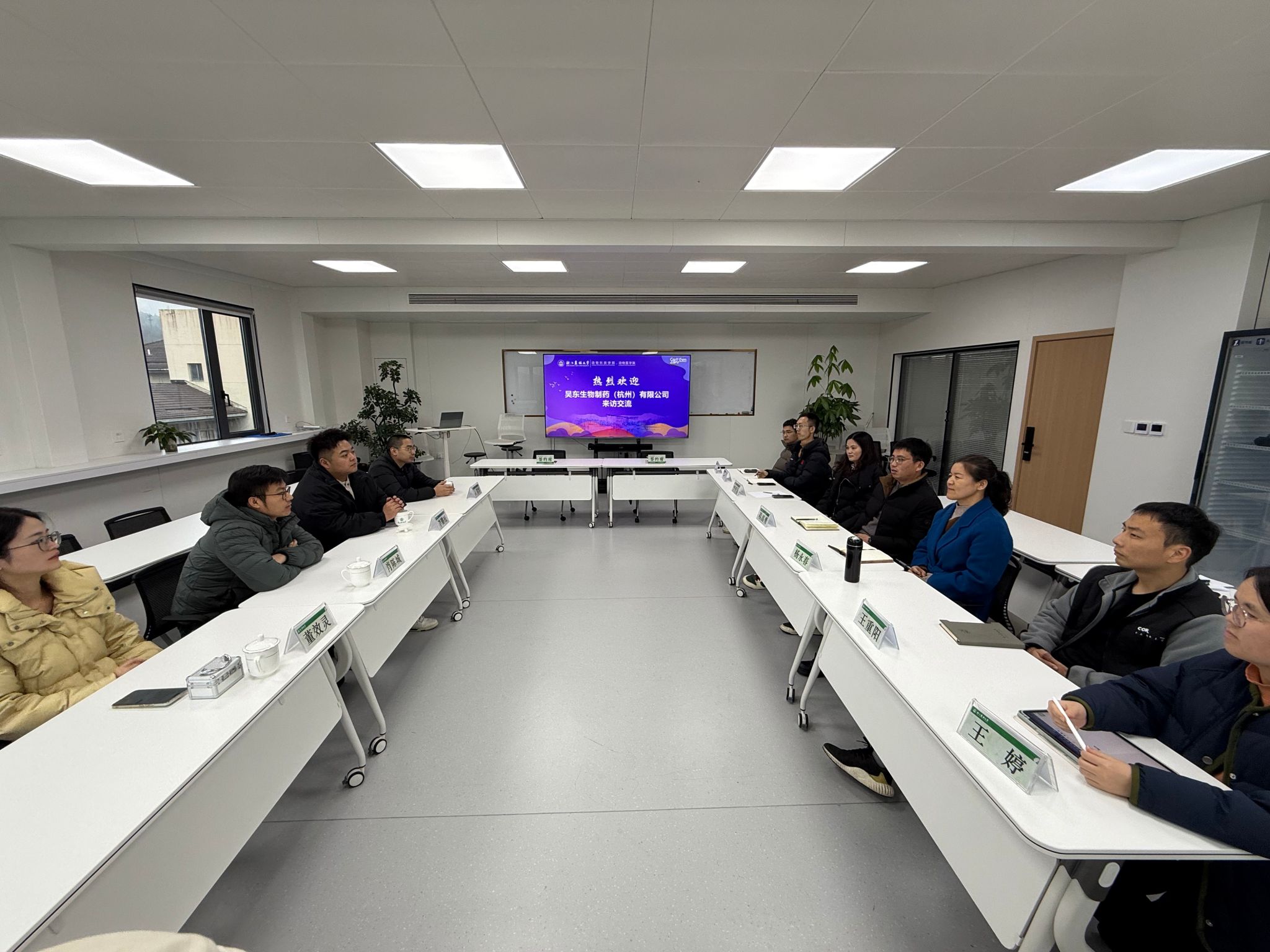 会上,双方围绕研究生联合培养、科研协同创新及后续合作推进机制等内容进行了深入交流。昊东生物制药(杭州)有限公司一行还与学院动物福利与野生动物保护团队教师进行了座谈交流,就相关领域的研究基础、技术需求及潜在合作方式等内容进行了深入探讨。