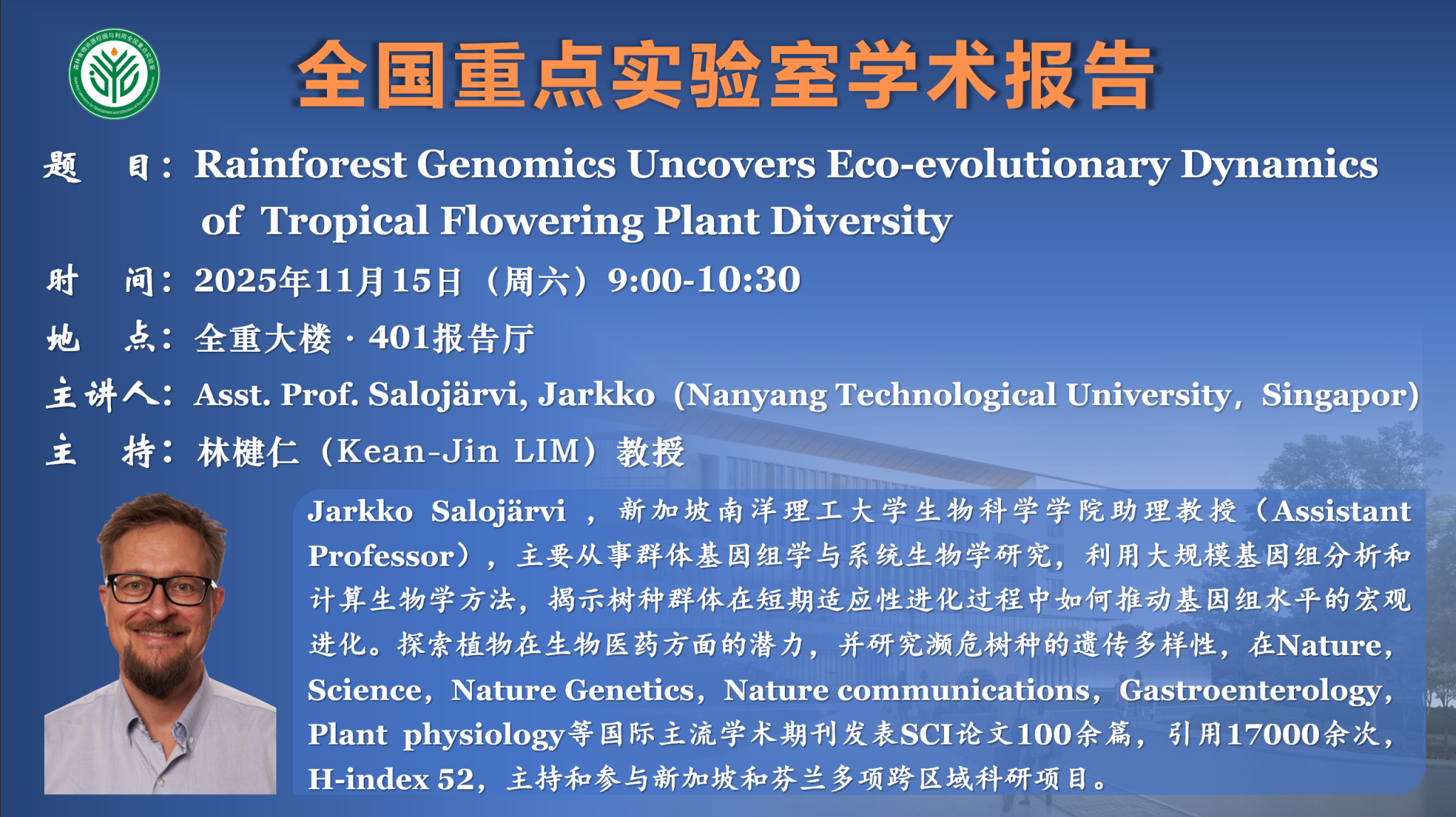讲座预告:Rainforest Genomics Uncovers Eco-evolutionary Dynamics of Tropical Flowering Plant Diversity