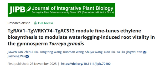 近日,全国重点实验室香榧团队在《Journal of Integrative Plant Biology》(中科院1区Top,IF-5yr=10.8)发表了题为“TgRAV1–TgWRKY74–TgACS13 module fine-tunes ethylene biosynthesis to modulate waterlogging-induced root vitality in the gymnospermTorreya grandis”(《TgRAV1–TgWRKY74–TgACS13模块通过精准调控乙烯合成增强香榧耐涝性》)的研究论文。该研究揭示了TgRAV1–TgWRKY74–TgACS13分子模块通过精细调控乙烯合成来增强香榧根系耐涝性,为理解裸子植物的涝害胁迫响应机制提供了重要科学依据。