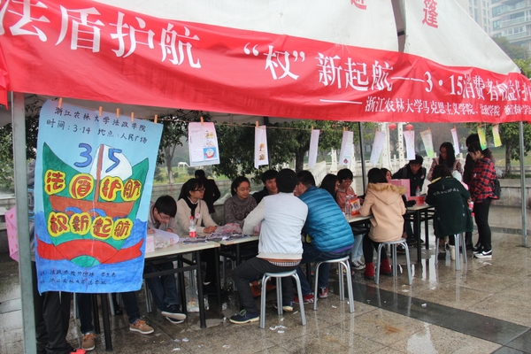 为增强居民的消费权益维护意识,提高居民的学法、守法、用法意识,贯彻落实依法治国方略,3月14日下午,马克思主义学院、法政学院雷锋班联合法学社在临安市人民广场举办了以 “法盾护航,‘权’新起航”为主题的消费者权益保护活动。现场100多名临安市民和学院近20名学生参与了本次活动。
