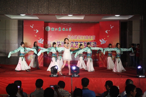 随后,村委大楼前的文艺表演伴随着欢快的《开心腰鼓》拉开了序幕。化龙村负责人致开幕词,对暑期实践团表示衷心的感谢,强调了五水共治的重要性,号召全体村民积极投入到五水共治当中。整场演出精彩纷呈,掌声不断,一曲《母亲》将晚会推向了高潮。文艺表演节目非富多样,有舞蹈、歌曲、小品、知识竞答等多种形式,饱含了同学们台前幕后的辛勤付出,演员们热情投入,展现出当代大学生积极活跃、乐于付出的精神风貌。