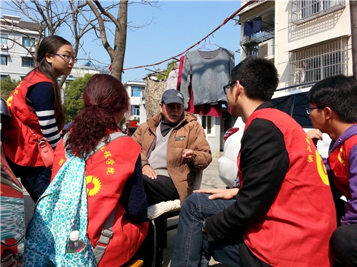 早上8点30分,阳光明媚,志愿者们满怀热情来到葡萄园社区,此时正有一些老奶奶老爷爷们在社区内晒太阳。志愿者们分成小组和老人们聊起家常,在交谈过程中,有几位退休老教师谈起了他们年轻时的教书经历,还有同学还为老爷爷放起了最爱听的昆曲。老人们喜笑颜开。
