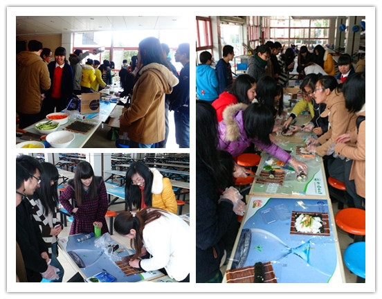 3月1日下午,大学生日语协会在东湖食堂一楼举办了“美食达人,寿司DIY”活动。为使大家对于文化的理解不再简单停留在书本上,而是深入课外语言实践中,大学生日语协会安排了“体验寿司制作”、“评鉴寿司”等活动环节,同时还组织会员们开展“蒙眼作画”等培养团队合作意识的小游戏,丰富的活动内容获得了会员的一致好评。