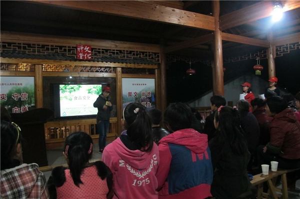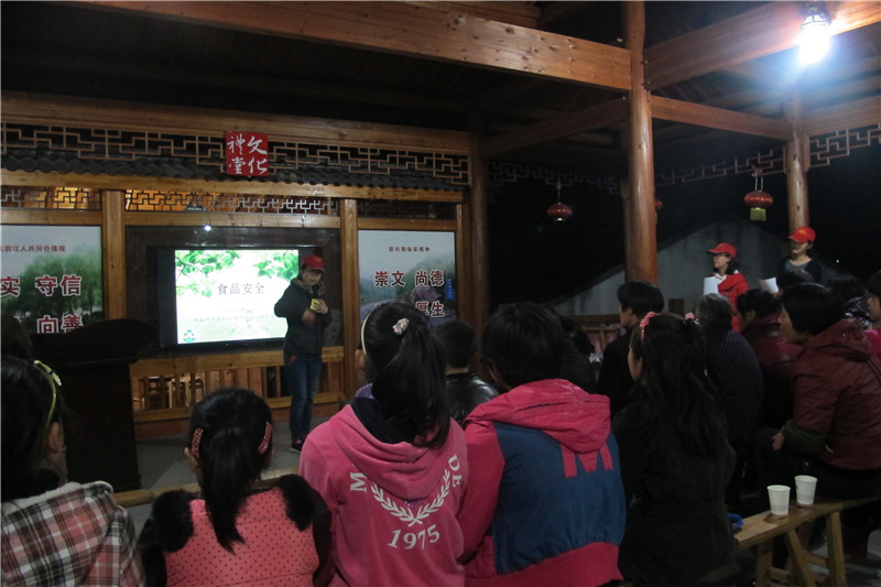 本次活动围绕食品安全和“五水共治”宣传两方面展开,志愿者们以PPT和展板形式给村民们宣传关于各类食物搭配禁忌、如何挑选各种水果、食品安全维权、药品安全、“五水共治”相关政策、田间节水以及生活节水等方面的知识。本次活动还穿插了食品安全知识小视频和小品《羊肉串》环节,小品情节贴近生活并且风趣幽默,让村民们在开怀大笑的同时也学习了食品安全知识。
