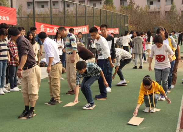 比赛开始,掌声、笑声不断。这里有倒跑接力比赛和颠乒乓球比赛,在近三十米的跑道上,一边是小心翼翼倒跑的选手,一不小心和相向的对手撞在一起,引来观众哄笑;一边是全神贯注追着乒乓球的队员们,一不小心失手,引来观众的叹息。接着又开展了螃蟹赛跑,一分钟摸耳转圈,摸石头过河以及最需要合作的四人五足比赛。一个个比赛妙趣横生、充满欢乐。后勤集团的工作人员们的加入也给活动更添了一份意义。