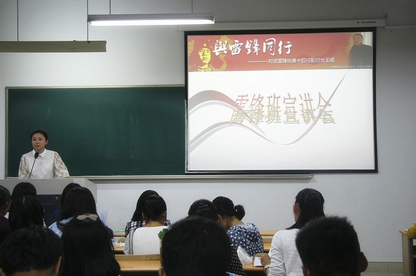 雷锋班宣讲会对学院特色品牌组织——雷锋班的性质、成立背景、班级建制、班级公约及宗旨以及通过这个平台所践行雷锋精神的大量精彩活动。雷锋班成员身着红色T恤,在雨中迎接新生的亲切笑脸,在寝室文明建设中的积极表现,在续写雷锋日记中书写的一个个感人故事都深深地感染了在座的每个新生,唤起了他们内心的雷锋精神,激发了新生投身社会实践,践行雷锋精神的热情。