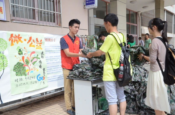 浙农林大新闻网讯 近日,工程学院“微公益”——迷彩情暖农民工活动启动。此项活动主要目的是积极践行生态理念,高效循环利用新生军训服装。