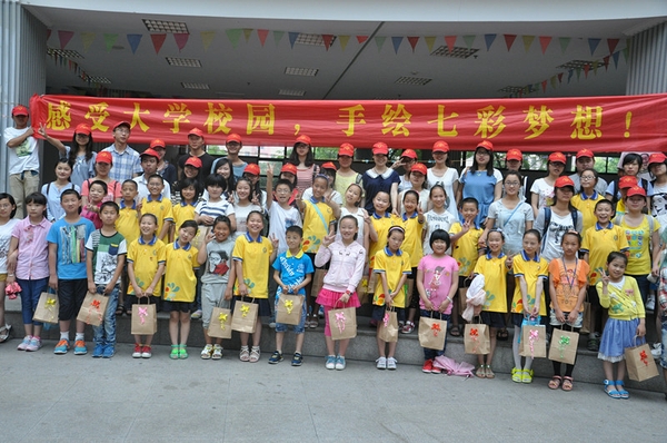 上午8点半,志愿者们就在东湖校区南大门迎接小朋友们的到来。一下车,志愿者们纷纷结对带领小朋友们参观美丽的校园。抵达活动中后,“绘七彩六一”手绘T恤活动正式开始,两个小朋友为一组,在家长和志愿者们的帮助下进行T恤彩绘。小朋友们的想象天马行空,不一会儿就画出了各式各样漂亮的T恤。活动结束后,志愿者和小朋友们合影留念,记录下这开心的一刻。下午,小朋友们收到志愿者们写给他们的信和精美的六一节礼物。