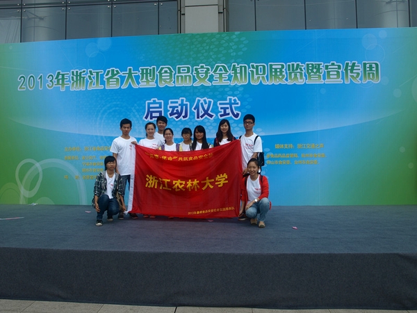 浙农林大新闻网讯 6月14日上午,农学院“追绿溯源 食不容缓 绿入我心——浙江农林大学绿色食品安全调研实践队”的十位同学在分团委负责老师的带领下赶赴杭州西湖文化广场,参加了2013年浙江省大型食品安全知识展览暨大学生暑期食品安全实践社会实践的启动仪式。
