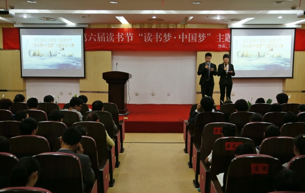 浙农林大新闻网讯 5月16日晚,东湖校区图书馆第二报告厅内激情飞扬,由校学生会主办的校第六届读书节“读书梦·中国梦”主题演讲大赛决赛在此举行。校党委宣传部、学工部、校团委等相关部门负责老师出席并担任评委,校学生会成员及选手各自亲友团参加观看。