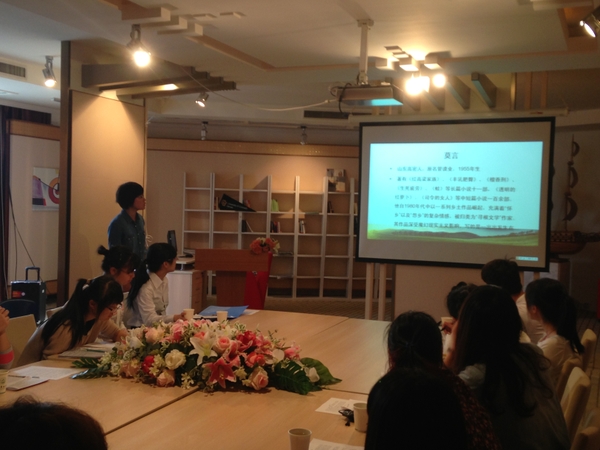 四名学生通过PPT展示和口头解说依次分享了莫言的《酒国》、《生死疲劳》、《丰乳肥臀》、《蛙》、《食草家族》五部作品,从内容、思想、、意义、价值评判等方面表达了自己对作品的理解。到场师生积极展开交流讨论,发表各自的看法和体会。大家谈吐风趣幽默,现场气氛活跃。