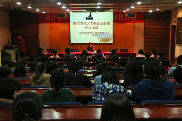 浙农林大新闻网讯 4月19日晚,浙江农林大学低碳示范楼评比活动在活动中心202举行。校党委学工部、校团委、后勤集团、校学生会、学生公寓自治委员会等部门的相关老师和学生代表出席活动并担任评委。来自东湖、集贤、西径、衣锦家园的9名低碳示范楼候选楼楼长,以PPT、视频等形式汇报各自低碳示范楼的建设成果,生动呈现90后的别样绿色生活。其中B8、C3、C5、S4公寓楼以其各自的低碳细节和文明风尚,被评为“低碳示范楼”,其楼长获“最佳风尚奖”。