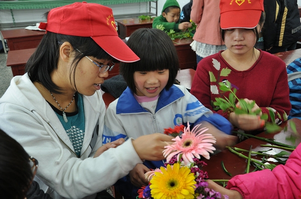 第一节课趣味成语,志愿者们通过PPT向小朋友们介绍了东施效颦、愚公移山等成语典故,小朋友们也纷纷讲述自己获得的启发,紧接着进行了看图猜成语、成语改错、你比我猜等一系列游戏,小朋友们踊跃参与,积极互动。课间,小朋友与志愿者在操场上手拉手玩起了“移板向前”的游戏。第二节课“插花艺术”,志愿者们先向小朋友们介绍各种花的种类、花语、花意等。在展示了漂亮插花图片之后,小朋友们在志愿者的细心指点下自己动手插花,最后乐滋滋地展示了自己的作品。