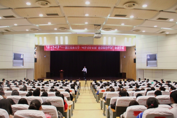 浙农林大新闻网讯 4月24日晚,由校团委和林生院共同主办,校社联和林生院分团委承办的“我的中国梦”——浙江农林大学“呵护美好家园,建设绿色中国”演讲专场在东湖校区图书馆第一报告厅举行,相关部门、学院负责人和师生代表500余人共同出席活动。