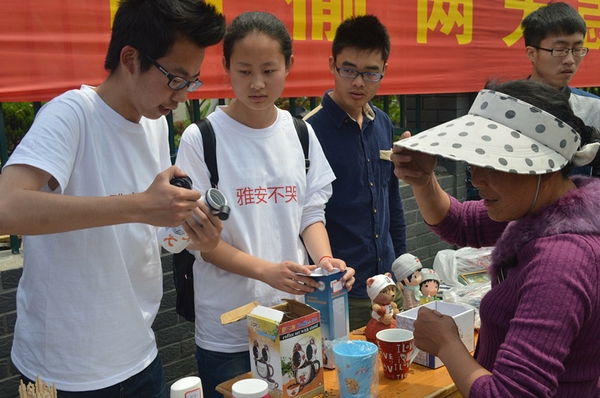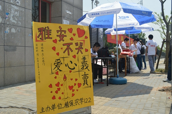 浙农林大新闻网讯 4月25日至27日,农学院植保122班与农学122班联合开展的“雅安不哭”——无标价爱心义卖活动在大西门顺利开展。此次义卖活动也是两个班级团日活动重要组成部分,义卖所得全部资金将通过“壹基金”如数捐给雅安灾区,
