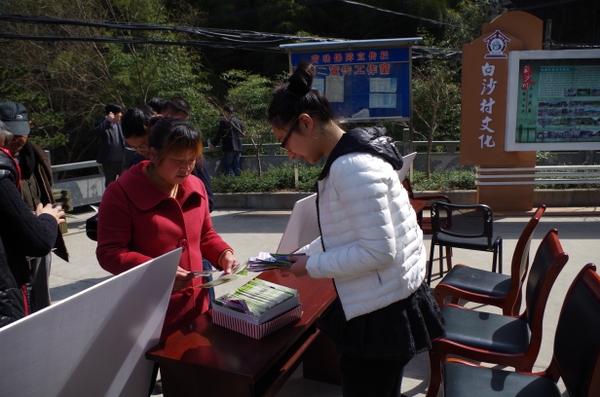 “服务三农”小分队在白沙村村委会办公楼前小广场设置宣讲点,通过展板向过往的村民展示经典的庭院设计案例。同时在村委会会议室,讲解员结合国内外先进案例,为在场的村民讲述生态农家乐的设计理念;在随后的“春播花卉知识秀”中,讲解员对几种春播花卉的习性、播种要点等进行了简要介绍,并向现场的村民发放了花卉种子和生态知识手册。在互动环节中,工作人员还针对村民提出的农家乐建设与庭院设计相关问题进行了讨论与解答。