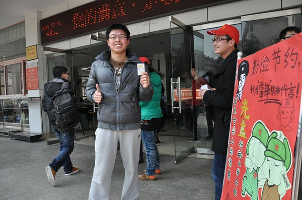 3月5日中午在东湖、集贤、西径三个食堂门口,农学院志愿者们一边高喊“拒绝舌尖上的浪费,‘光盘’行动从我开始”的口号,一边向人们发放精心制作的卡套以此提醒同学们在就餐时养成勤俭节约的好习惯,将“光盘”行动进行到底。此次活动发放了近1000张卡套,该卡套受到同学们的热烈欢迎,大家纷纷表示“小米粒,大光盘,拒绝浪费从我做起”。
