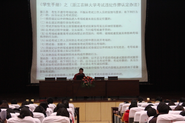 浙农林大新闻网讯 为贯彻学校及学院有关严肃考风考纪的政策,12月23日下午,法政学院由辅导员老师在图书馆大报告厅为学院11、12级学生作了关于考风考纪的报告。