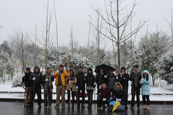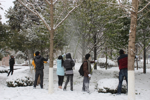 浙农林大新闻网讯 1月4日中午,信息工程学院的学生党员在护园工人的指导下,冒雪清理树上积雪,以实际行动来爱护校园花木。