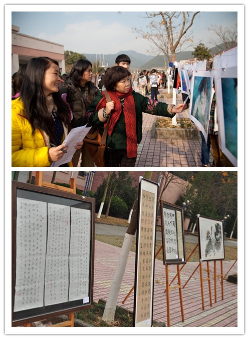 12月12日至14日,第八届大学生校园生活原创艺术作品大赛展览在东湖食堂前举办。文化学院院长王旭烽、党委书记王小德等学院党政领导、教务处有关领导、指导老师莅临活动现场并对作品进行了评审。