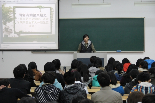 浙农林大新闻网讯 12月4日晚,法政学院第八期“同窗有约”之研究生与大一新生交流会在教4403顺利举行。四位优秀研究生代表与上百名新生参加了此次交流会。