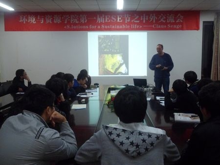 浙农林大新闻网讯 11月22日晚,环境与资源学院“第一届ESE节之中外交流会”在学6501举行。来自德国的Claus Senge教授在省特聘教授裴建川的陪同下,作了一次生动的演讲,令众多环资学子受益匪浅。