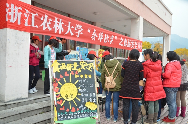 浙农林大新闻网讯 11月24日至12月1日,为期一周的校首届“春华秋实”食品安全知识宣传周顺利开展,农学院团学中心及各食品专业班级都积极加入到此次宣传活动中来。