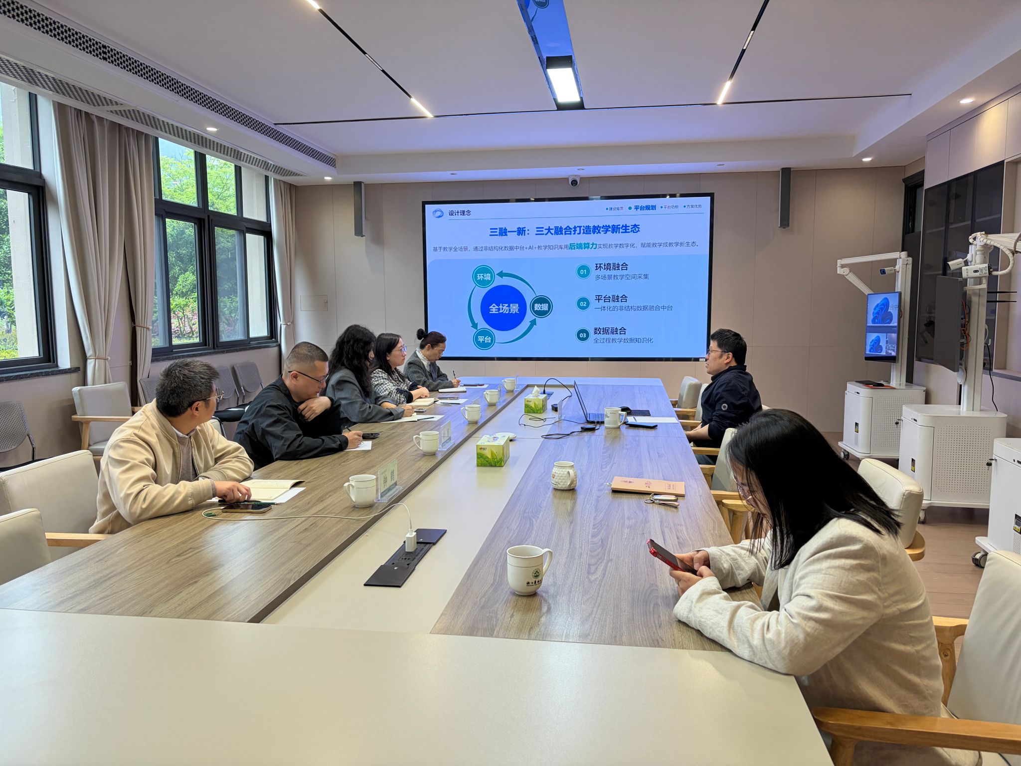 莫路锋对王侦一行的到访表示欢迎,并简要介绍了我校信息化建设的总体情况。会上,他重点从建设思路、具体措施、平台功能及应用成效四个维度,详细介绍了我校自主研发的“天目云”智慧教学平台。莫路锋表示,“天目云”平台以服务师生教学需求为核心,依托学校信息化基础设施,逐步构建起覆盖课前、课中、课后全流程的智慧教学环境,在提升课堂教学互动性、优化教学资源配置、推动教学数据驱动决策等方面取得了积极成效。